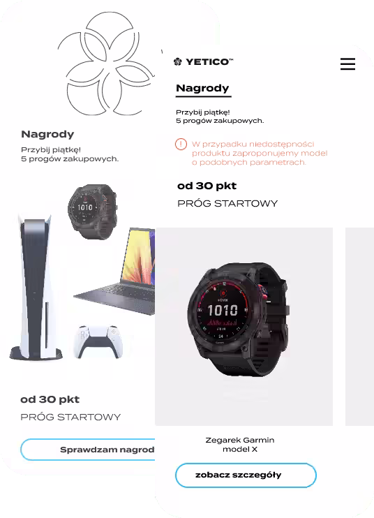 Uczestnicy rejestrują się w programie za pomocą kodu, który otrzymali od nas w zaproszeniu, kupują produkty Yetico, a za każde zamówienie na ich koncie pojawiają się punkty, które mogą wymieniać na nagrody rzeczowe lub karty podarunkowe.